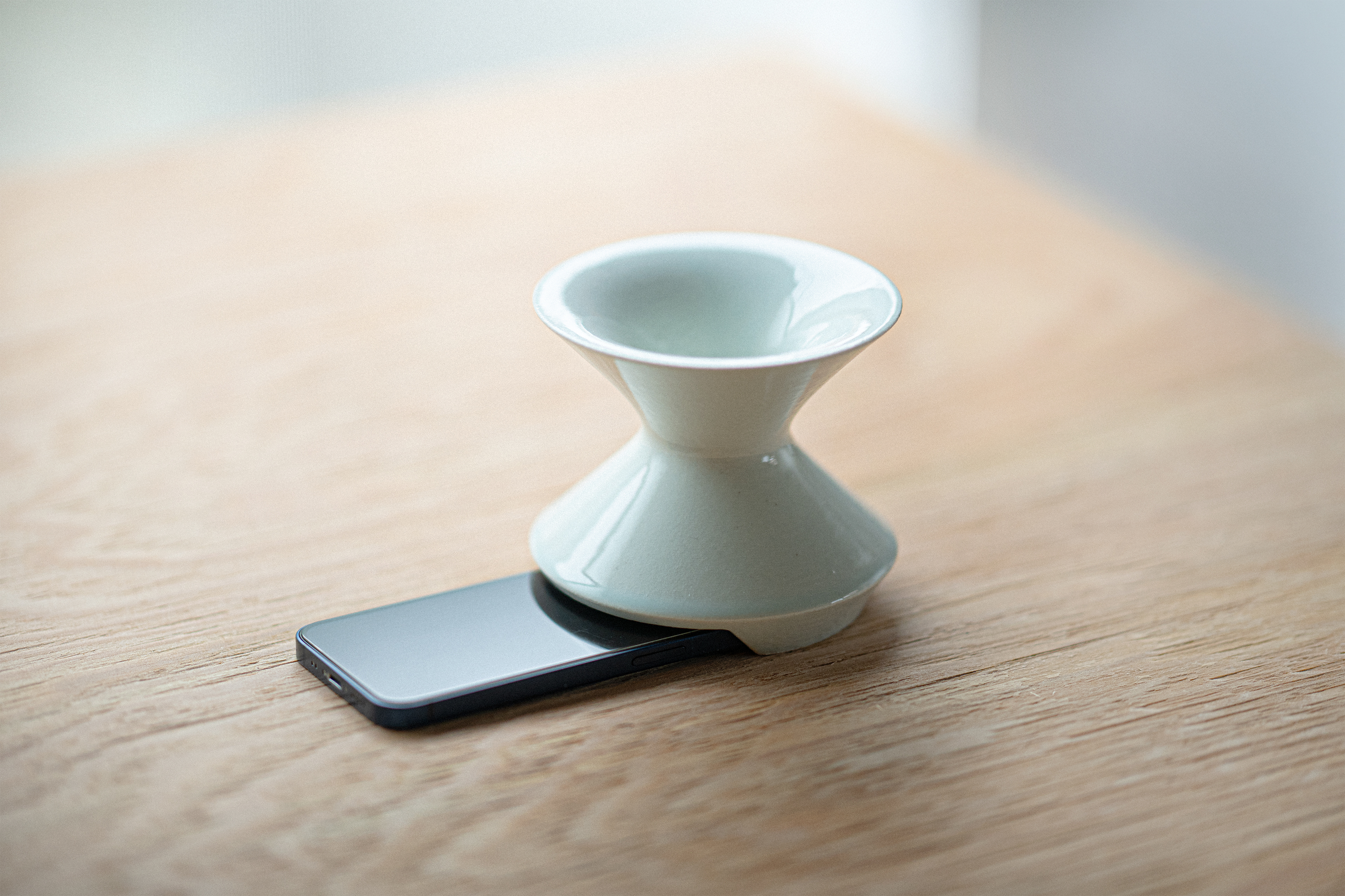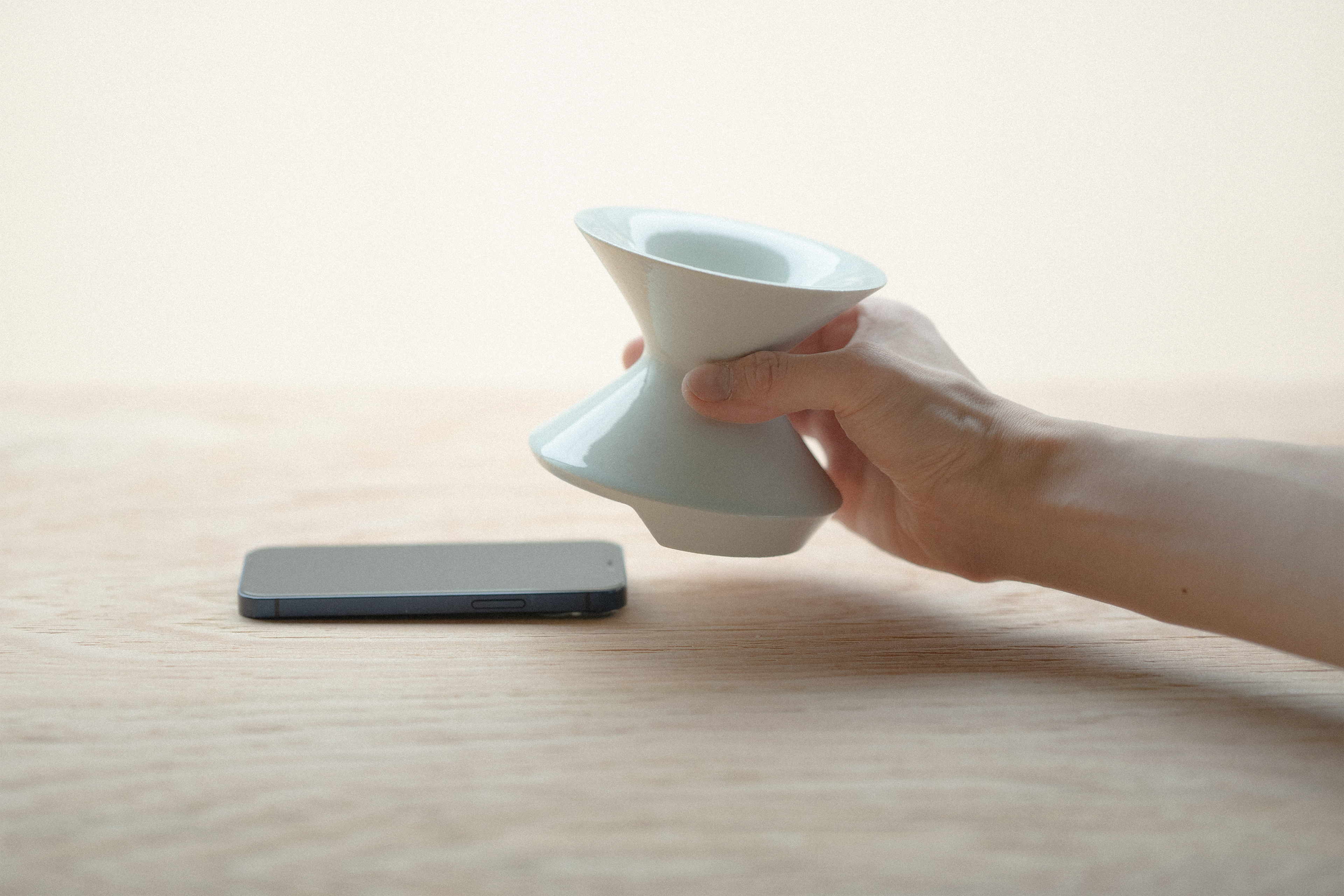 スマートフォンの上に置くだけで音を拡散させる、アナログスピーカーです。内部には管楽器や貝殻のような空洞構造を備え、内側で音を響かせながらやわらかく広げていきます。素材には釉薬を施した陶器を用い、花瓶やマグカップ、食器のような日用品に近い質感を与えました。 使っていないときにも違和感なく空間に置かれる、自然な佇まいを目指しました。
