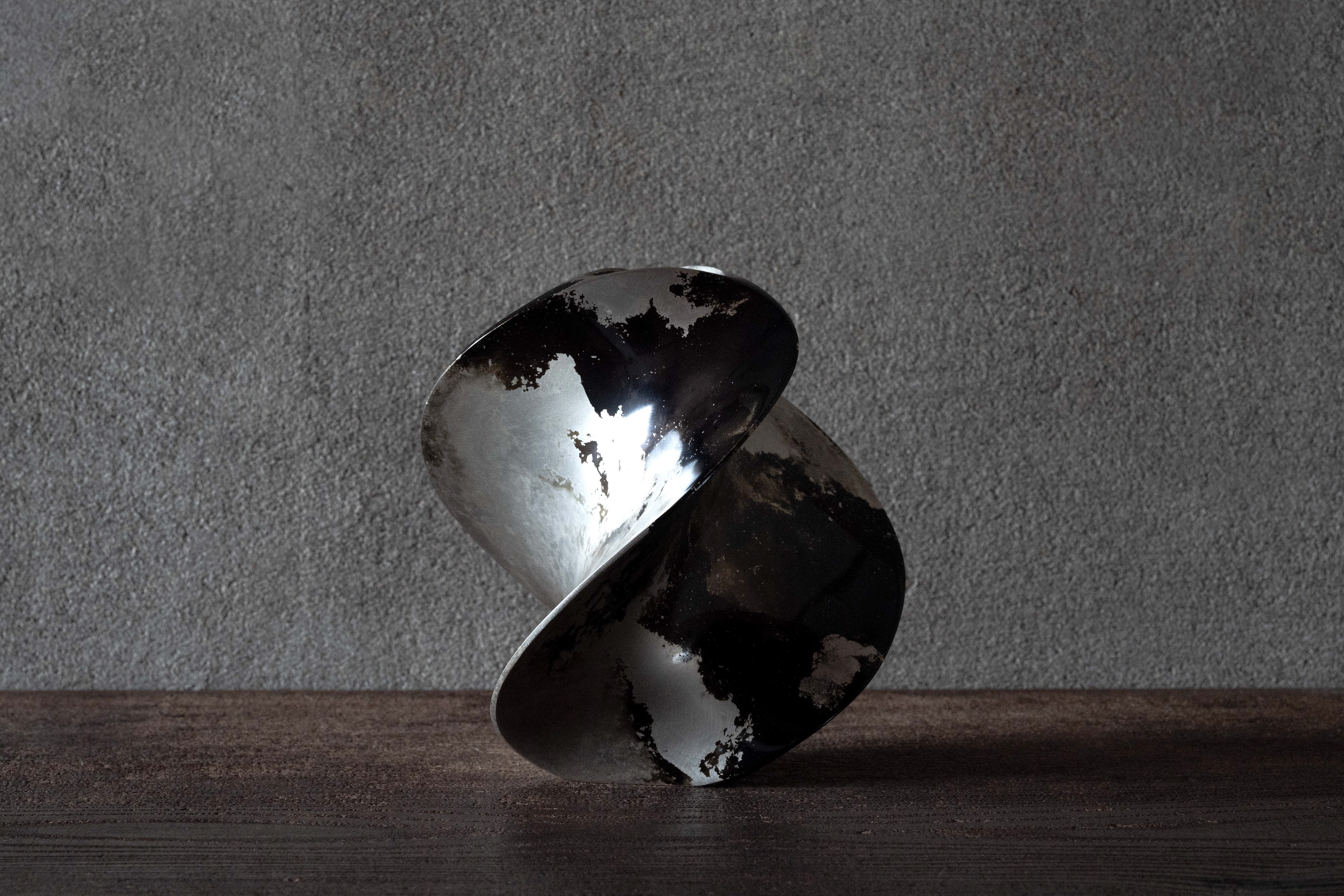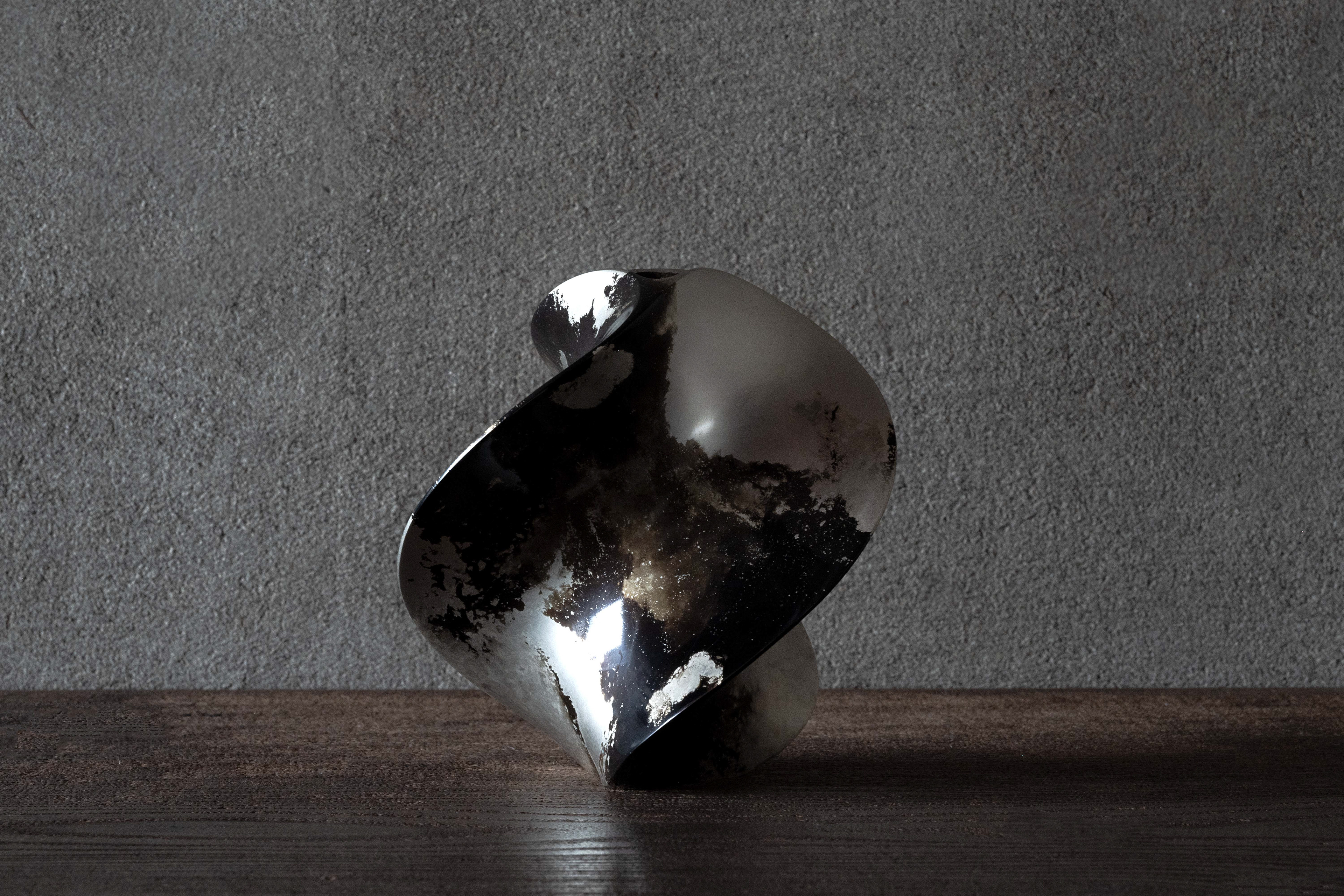 The design of this vase is beautifully curved, like a dress when dancing the waltz or a ship propeller. The unique pattern on the surface is the result of a traditional casting technique known as fukiwake that mixes two types of metal producing a unique marbled pattern. The copper alloy has a disinfectant quality which extends the life of cut flowers. Waltz retains stability, even when adorned with large flowers or branches thanks to the robust metal from which it is formed.