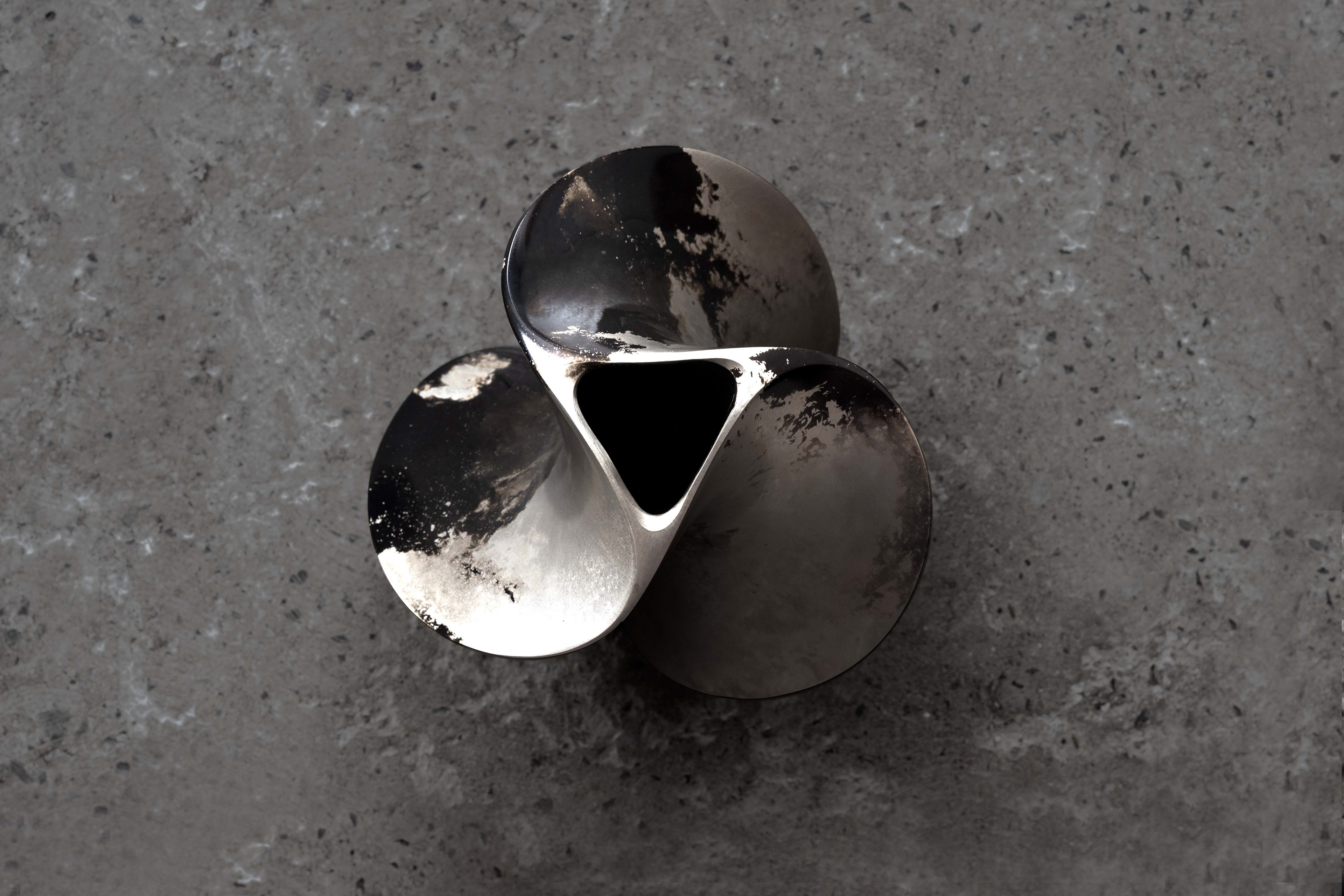 ワルツを踊っている時のドレスのような、あるいは船のプロペラのような、軽やかな曲線をまとったデザインの花器。表面の独特な模様は、伝統的な「吹き分け」の技法を用いている。2種類の金属を同時に流し込み、マーブル状の模様を生み出す技法であり、その模様は1つひとつが世界に1つしか存在しない。加えて、それぞれの面には違う模様が浮き出るために3つの表情を楽しむことができる。銅合金は殺菌作用があるため、切り花が長持ちすると言われている。また、金属の重量感と丈夫さで、大きな花や枝ものを生けても非常に安定感がある。